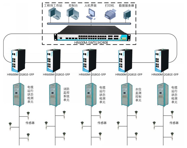 为了满足智能电网建设智能化,信息化,自动化的要求,整个高压电缆在线监测系统采用高速、坚强、可靠的光纤网络作为信息传输介质,使用以太网技术来传输监测数据,并采用MW-Ring环网技术保证数据的稳定可靠。在整个系统的各监测点使用一台以太网交换机将监测点的各种监测信号通过光纤环网汇聚至中心监控站。