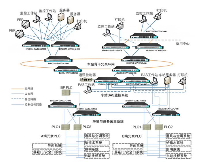 线路中心BAS系统采用核心交换机主备冗余相连模式,各接入设备(监控工作站、服务器、FAS工作站等)亦采用主备连接模式与核心交换机相连。
